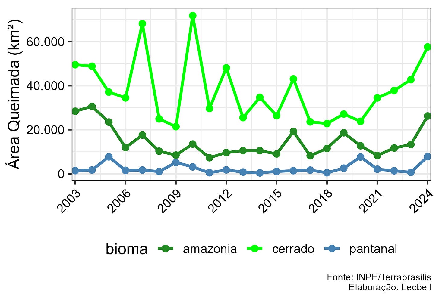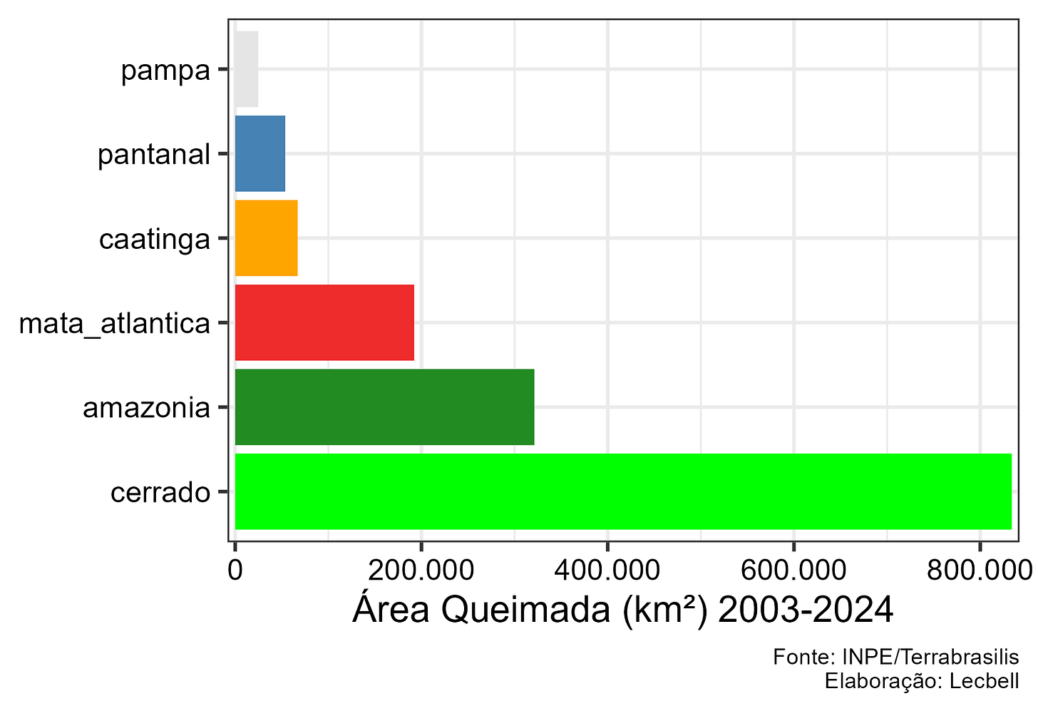 Considerando o período 2003-2024 (até meados de agosto no último ano), a soma da área anualmente devastada pelo fogo em cada bioma é explicitada no gráfico abaixo: