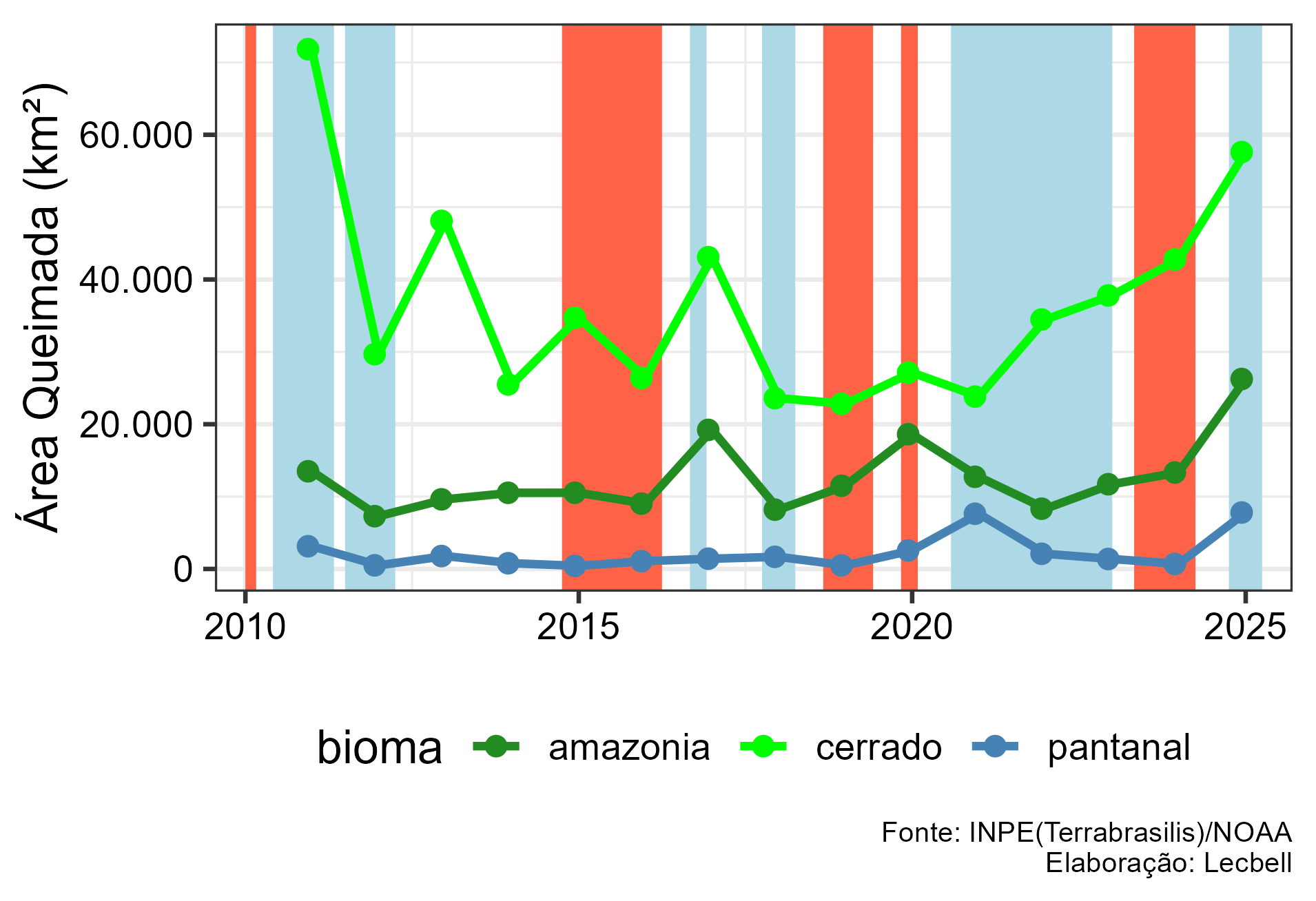 O último período prolongado de La Niña parece ter contribuído para um aumento notável de área queimada no Cerrado, enquanto o El Niño, embora com algum atraso, tende a incrementar a área queimada na Amazônia (causa estiagem por lá). Mas as fases ENSO são apenas um dos fatores incidentes sobre o favorecimento ou desfavorecimento do fogo nestes biomas.