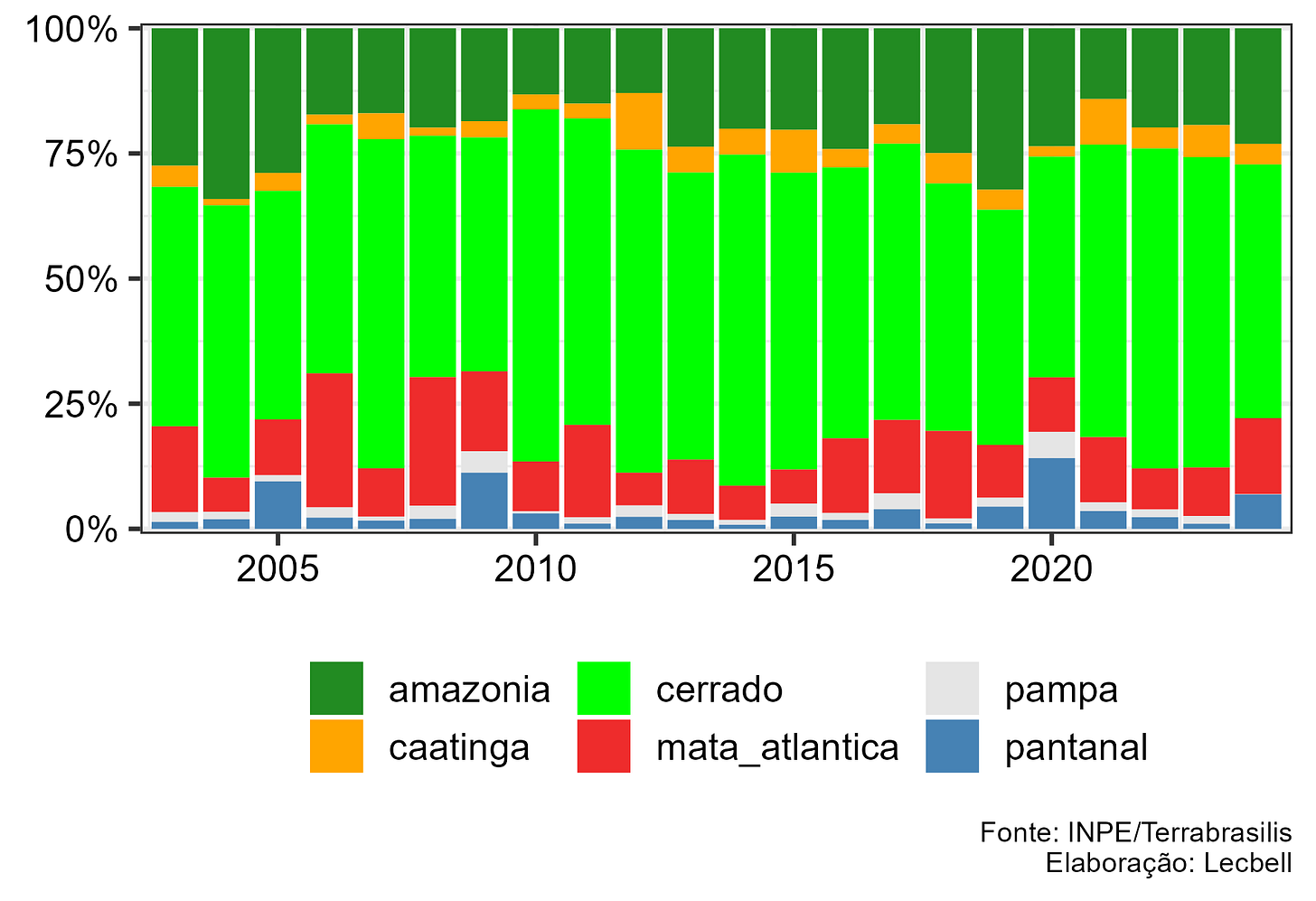 Independentemente da causa do fogo, é fácil perceber que a maior área afetada por incêndios é o Cerrado. O Gráfico abaixo mostra a proporção da área total devastada pelo fogo de acordo com o bioma, ano-a-ano, entre 2003 e início de agosto de 2024.
